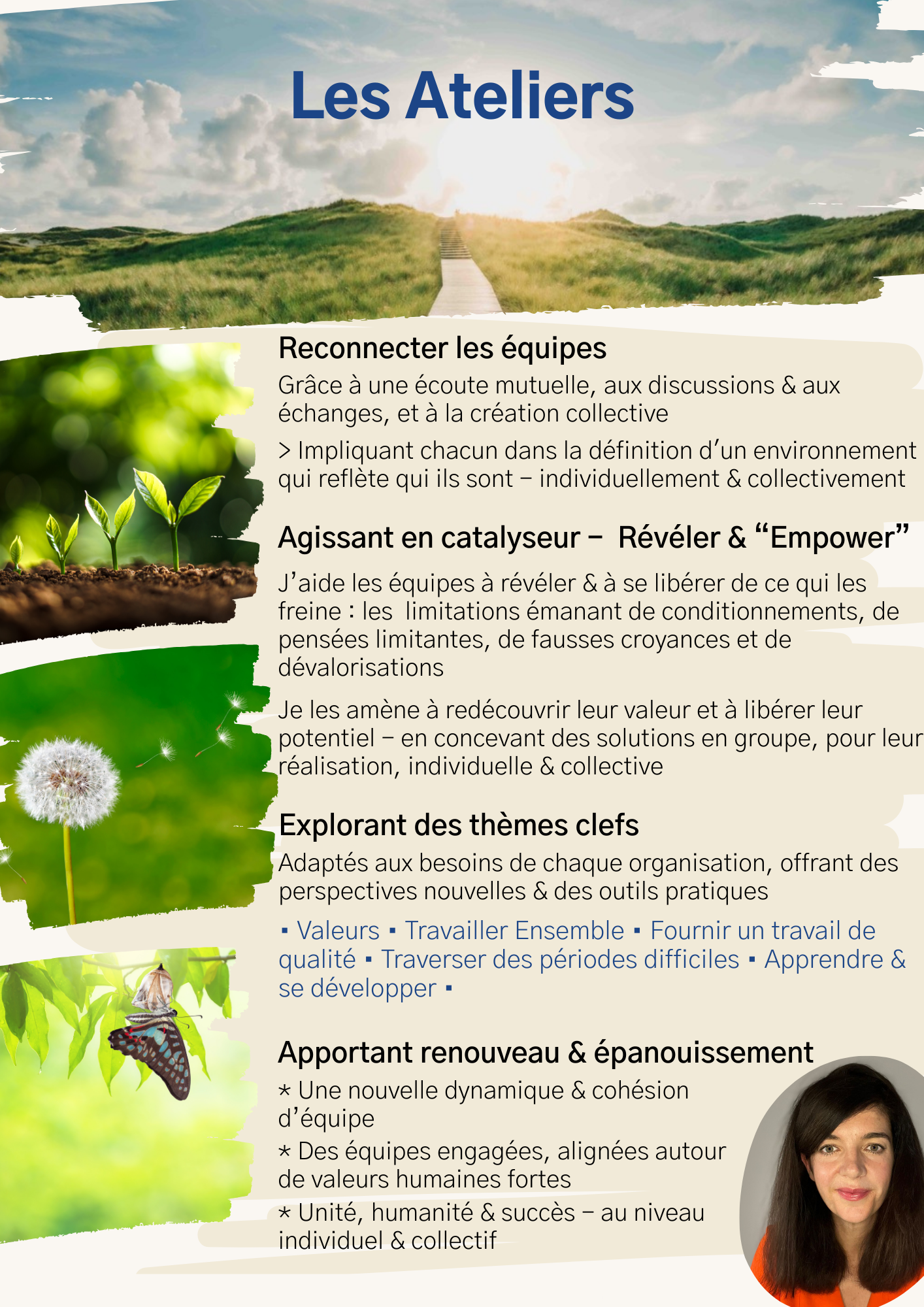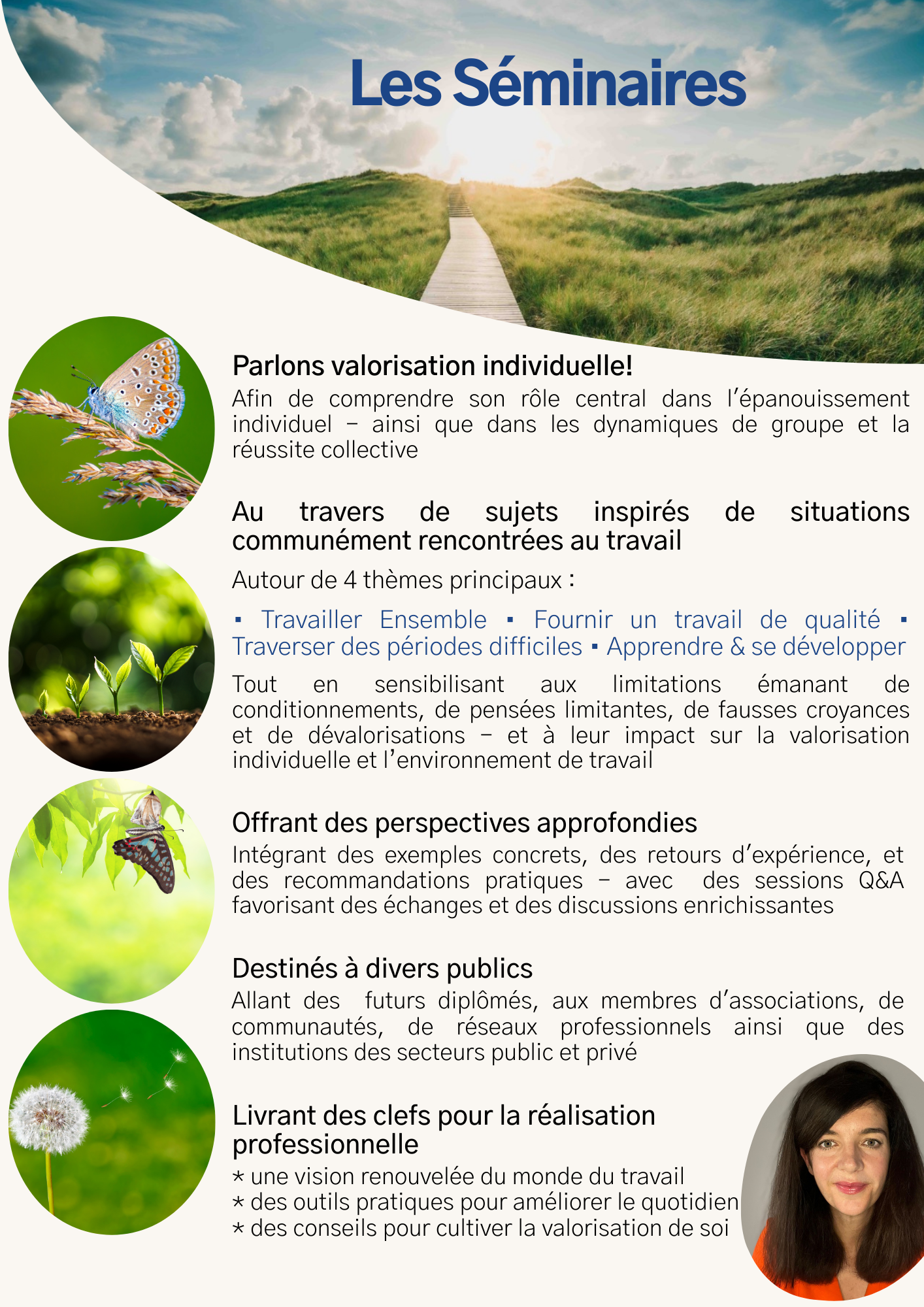 Conçus comme complémentaires aux séances individuelles, les ateliers et les séminaires visent à sensibiliser aux limitations émanant de conditionnements, de pensées limitantes, de fausses croyances et de dévalorisations, et à leur impact sur la valorisation individuelle et l’environnement de travail.