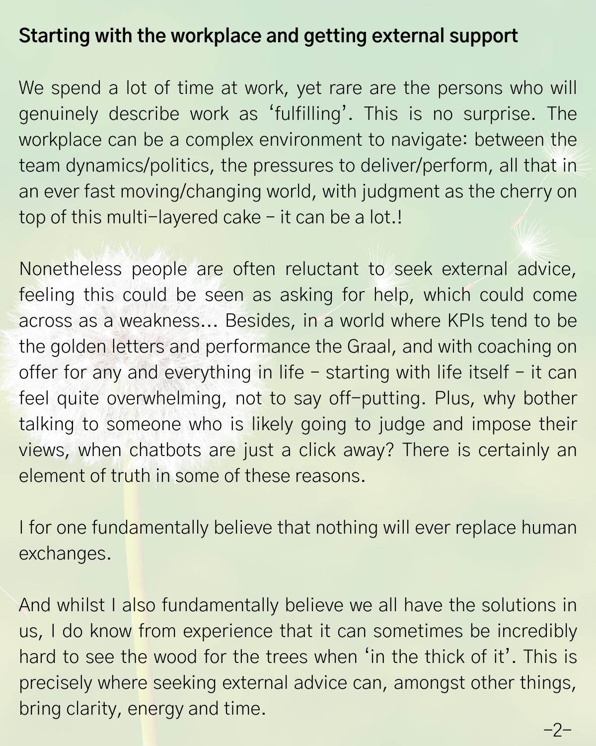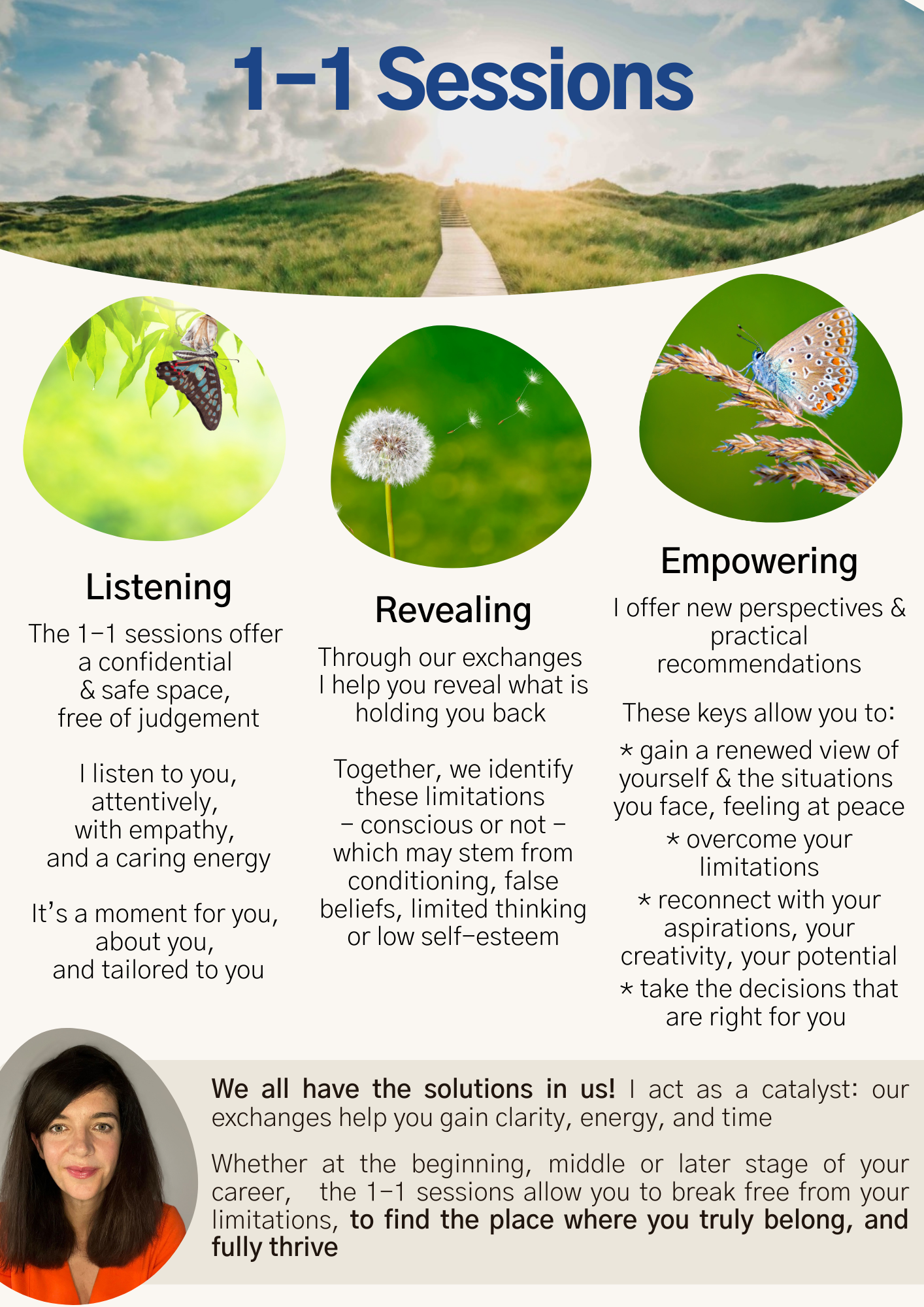 I’ll also share more about my unique approach – whether through 1-1 sessions, workshops or seminars – built on deep listening, fresh perspectives, and practical suggestions, always free of any judgement, and with a caring energy.