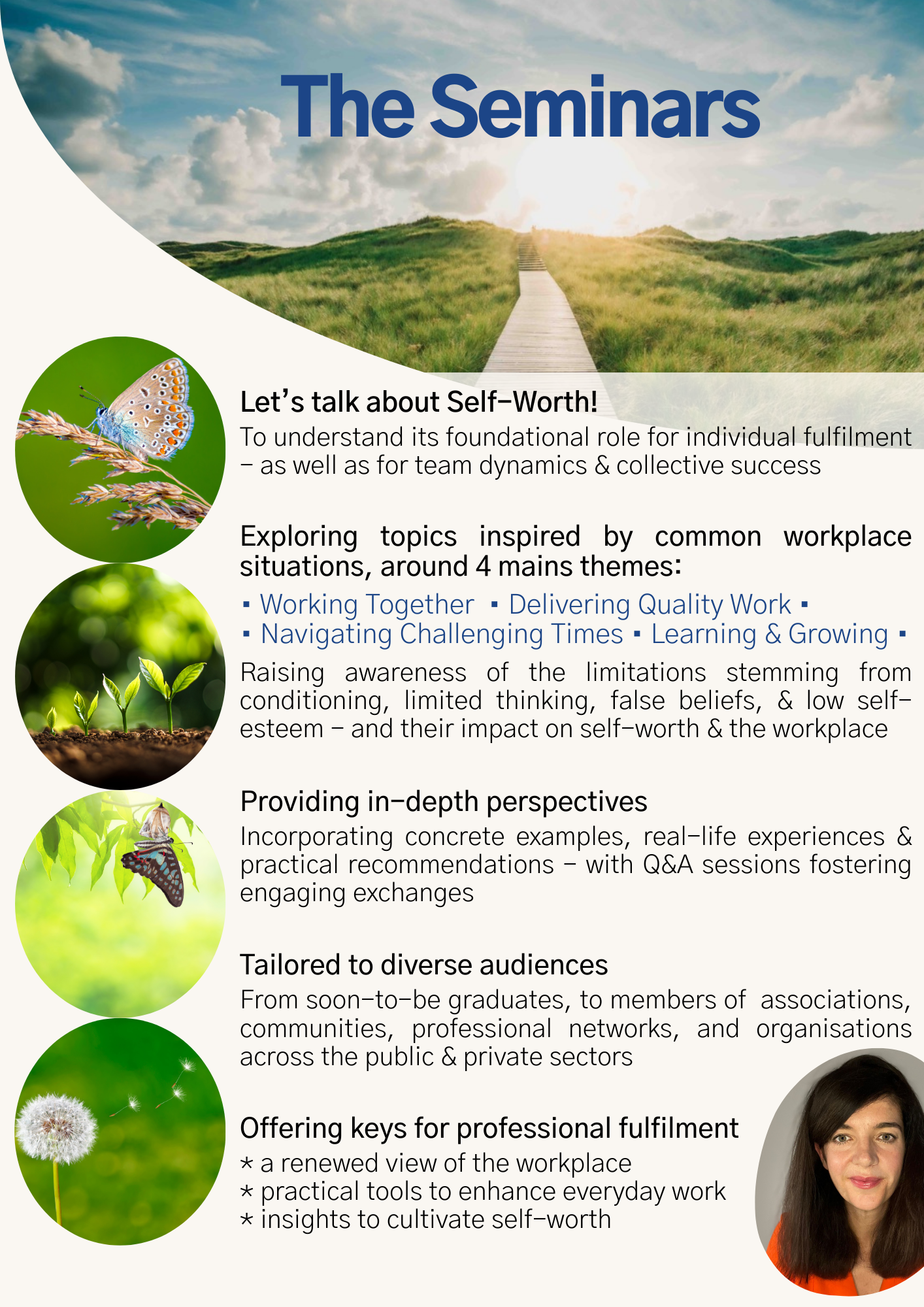 I offer practical recommendations and tools to enhance everyday work and cultivate self-worth, equipping participants with keys for their professional fulfilment.