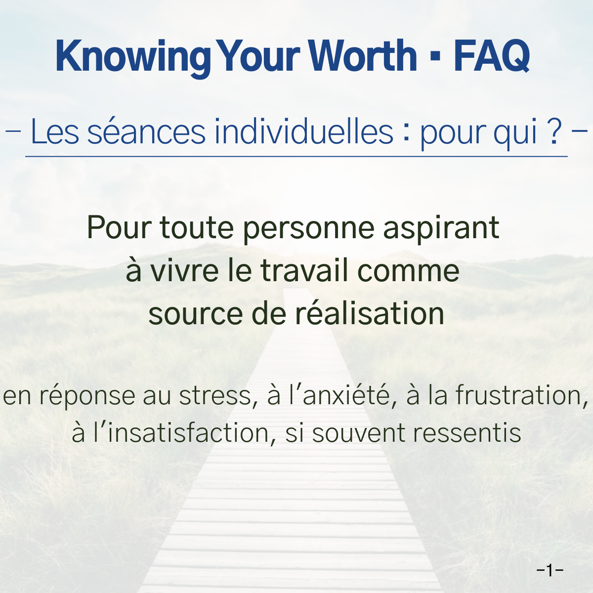 La première séance dure 1h. À l’issue de cette séance, nous définissons ensemble le type d'accompagnement adapté à vos besoins, et je vous recommande la durée et la fréquence des séances afin que vous puissiez faire votre choix en conscience.